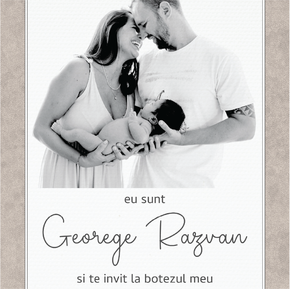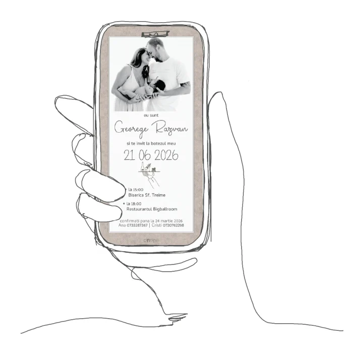 Vei primi invitația în format digital (JPG/PNG pentru poze, PDF pentru print, GIF pentru animate, în funcție de model) direct pe email. Gata optimizată pentru WhatsApp, Facebook, Instagram!