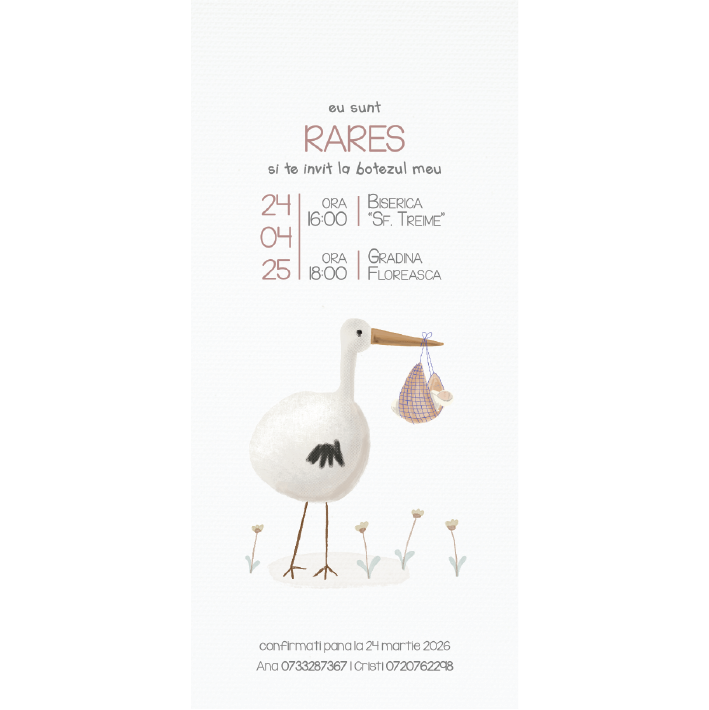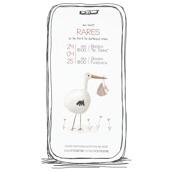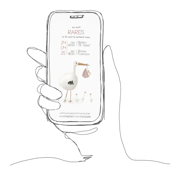 • Mai mult, această invitatie digitala poate fi personalizata în funcție de preferințele voastre. De exemplu, puteți modifica culorile și fonturile, dacă modelul permite, pentru a se potrivi cu tema aleasă. Totodată, aveți posibilitatea de a adăuga detalii suplimentare, cum ar fi numele nașilor, numele părinților și numerele de telefon pentru contact. Alte detalii opționale pentru invitați pot fi adăugate fără a compromite armonia vizuală și calitatea estetică a invitației.