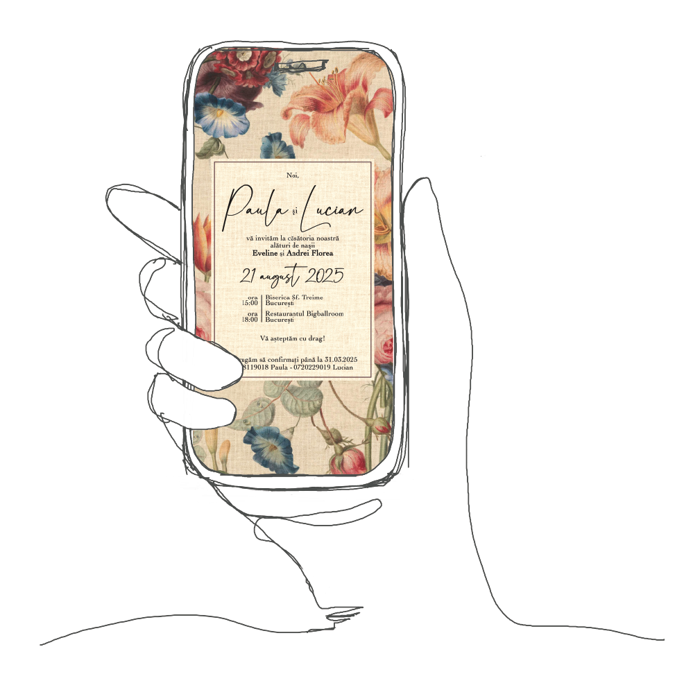 Vei primi invitația în format digital (JPG/PNG pentru poze, PDF pentru print, GIF pentru animate, în funcție de model) direct pe email. Gata optimizată pentru WhatsApp, Facebook, Instagram!