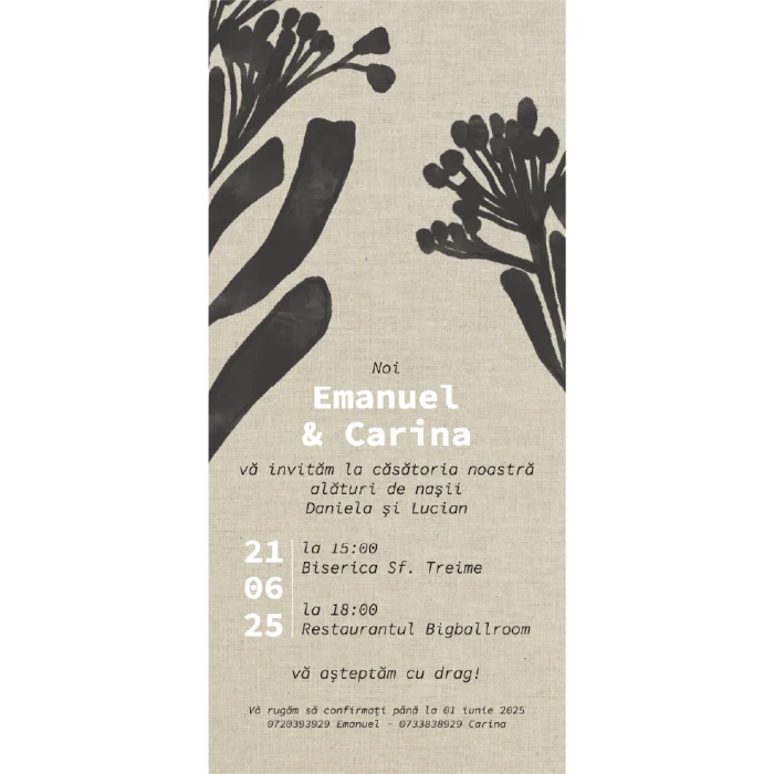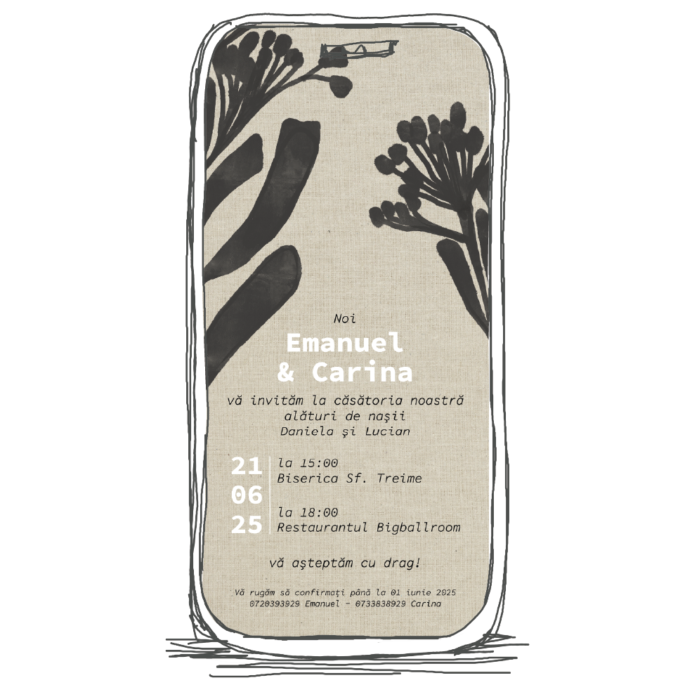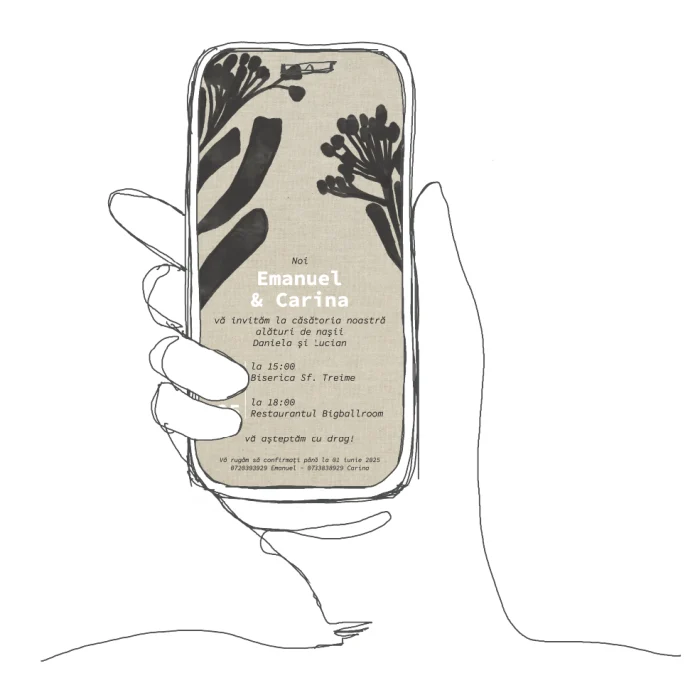 • Această invitatie digitala de nunta model N11 textura in, este soluția ideală pentru a adăuga un plus de eleganță și originalitate evenimentului vostru special. Fiecare invitație este desenată manual, ceea ce garantează un design unic și aparte.