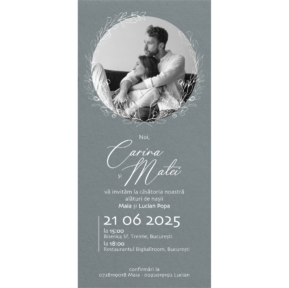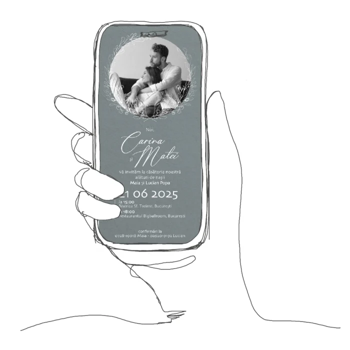 • ceastă invitatie digitala de nunta Model N20 este soluția ideală pentru a adăuga un plus de eleganță și originalitate evenimentului vostru special. Fiecare invitație este desenată manual, ceea ce garantează un design unic și aparte.