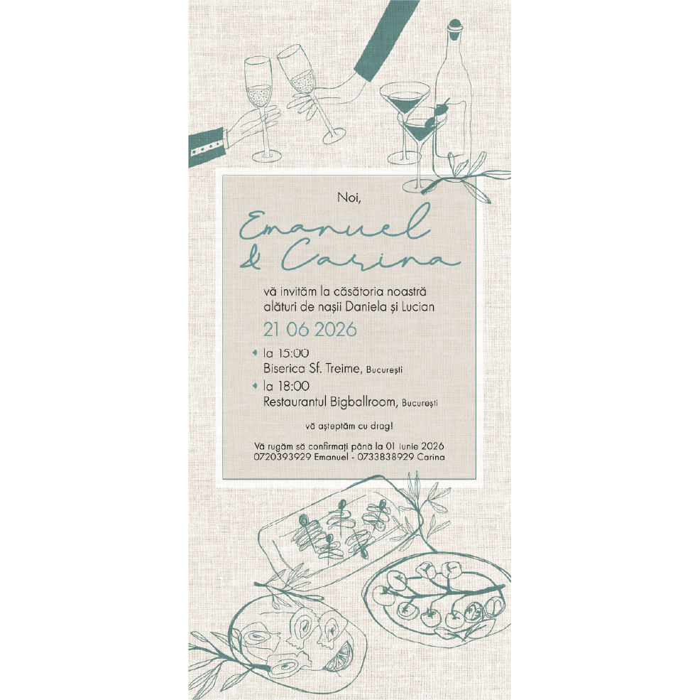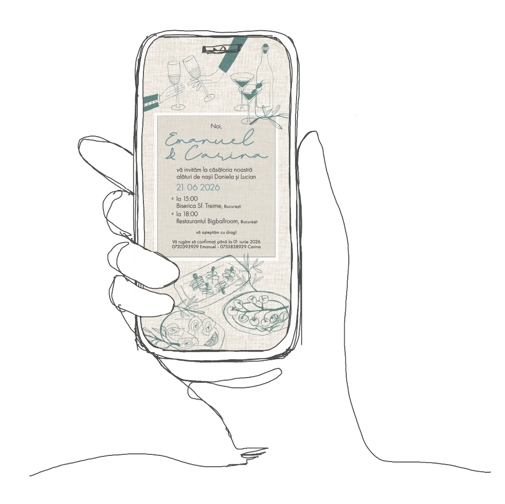• Această invitatie digitala pentru nunta model N3 cu textura in, este soluția ideală pentru a adăuga un plus de eleganță și originalitate evenimentului vostru special. Fiecare invitație este desenată manual, ceea ce garantează un design unic și aparte.