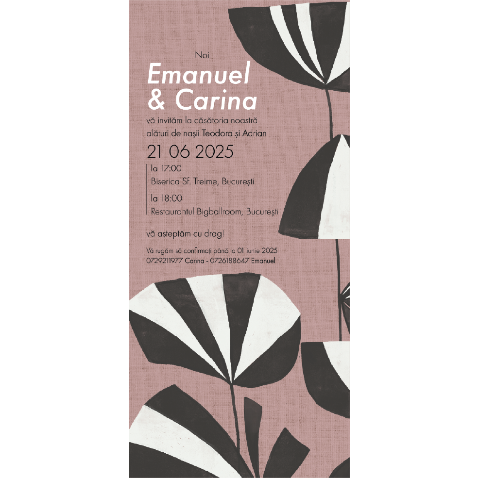 • Această invitatie digitala de nunta model N5 cu textura in, este soluția ideală pentru a adăuga un plus de eleganță și originalitate evenimentului vostru special. Fiecare invitație este desenată manual, ceea ce garantează un design unic și aparte. Astfel, veți impresiona toți invitații.