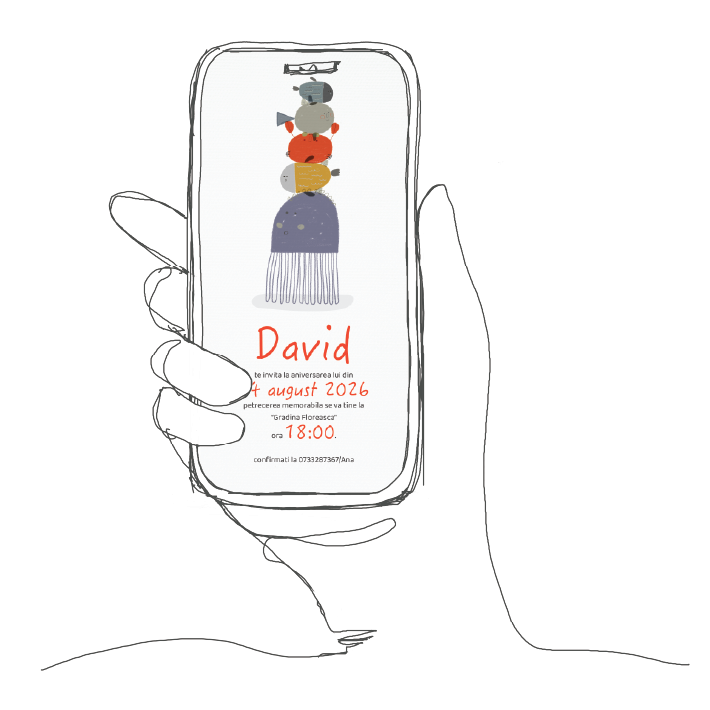 Vei primi invitația în format digital (JPG/PNG pentru poze, PDF pentru print, GIF pentru animate, în funcție de model) direct pe email. Gata optimizată pentru WhatsApp, Facebook, Instagram!
