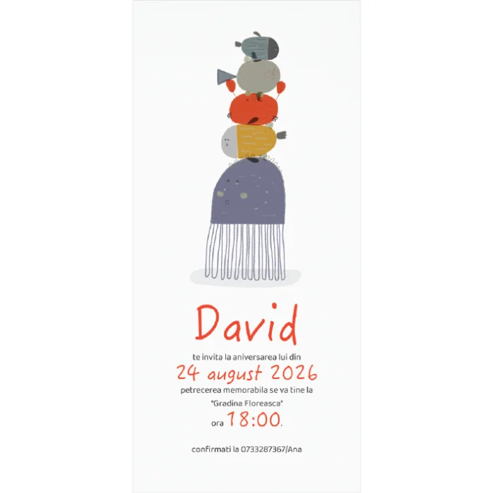 • Acest model de invitatie zi de nastere pentru copii, este soluția perfectă pentru a adăuga o notă de eleganță și originalitate evenimentului vostru special. Fiecare invitație este desenată manual, garantând un design unic și deosebit, astfel încât să impresionați toți invitații.